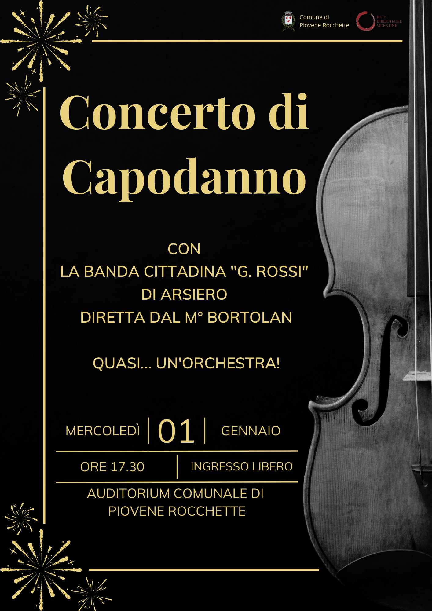 Per festeggiare con gioia il nuovo anno l'Amministrazione comunale propone un concerto vario e pieno di sonorità realizzato dalla Banda Cittadina "G. Rossi" di Arsiero che negli anni ha saputo arricchire il proprio organico con nuove realtà come il gruppo di cornamuse e le voci delle cantanti, ampliando così i propri orizzonti senza dimenticare la storia e la tradizione delle formazioni bandistiche.