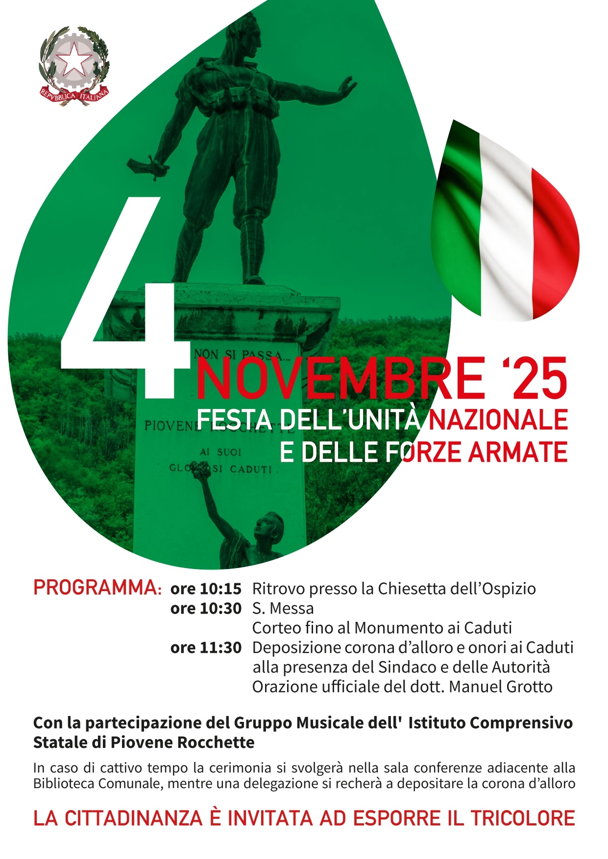 Il Comune di Piovene Rocchette invita la cittadinanza a partecipare alla cerimonia commemorativa che si terrร martedรฌ 4 novembre 2025